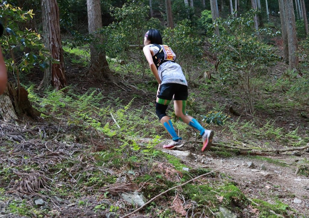 折り返しの後は緩い傾斜の砂利道を登って横川(よかわ)エイドへ。エイド手前の木の階段が、1段1段の間隔が広くてえらい。ペースが落ちてくると、(まだ40kmを過ぎたあたりでようやく半分、あと40kmも走りきれるのか?)と弱い心も。そんなとき、同じ50mileを走る友人が抜いていくときに、「くっすん!いけるよ。絶対完走しような。」と声をかけてくれたのがすごくありがたかったです。