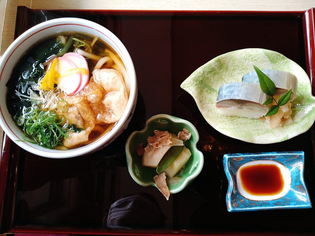 また、鯖寿司のセットでは鯖寿し膳というのもあります。こちらは鯖寿司2切れと揚げ栃餅入りうどんのセットです。栃餅はトロトロ!また、山菜も入っています。
