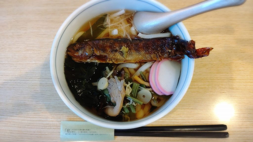 岩魚山椒煮うどんは、山菜うどんに岩魚が丸々1匹のっています。岩魚はほろほろになるくらいよく煮られていて、山椒の風味がしてとてもおいしいです。岩魚も渓流のある朽木の名物。