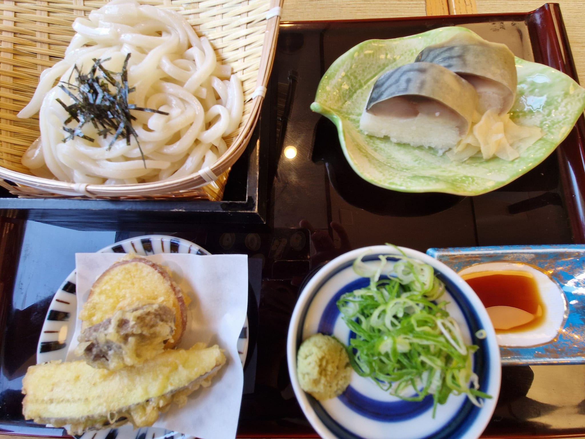 うどんは細くてつるつるしたスタンダードなお味。お風呂上りで火照った体で冷たい麺をすするのは最高。そして、鯖寿司はとても肉厚。鯖寿司目当てでこのお店に来るのもありかも、と思うくらい美味しいです。鯖寿司2切れついたセットでこのお値段はとてもお得。天ぷらもサクサクでした。