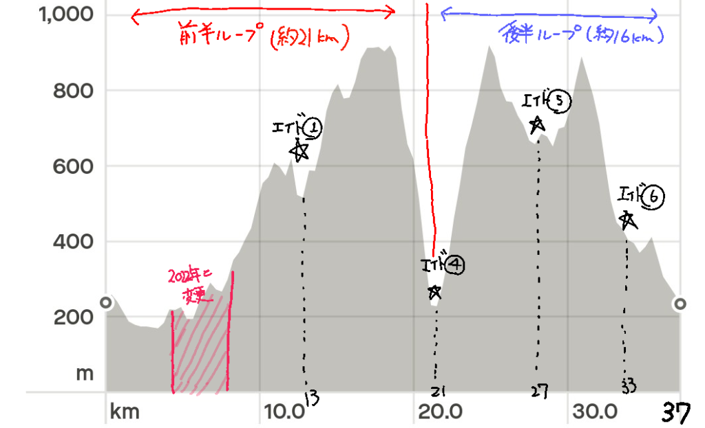 2022年は前半が2時間17分52秒、後半が2時間14分。今年は前半4km増える分、前半が2時間40分、後半が2時間10分、4時間50分切りを目標にしていました。実際は4時間56分1秒。上半身が使えるようになってきてから登りの調子がよく、登りの多い前半パートは2022年よりタイムを縮められたものの、後半ループでタイムを6分も落としている…